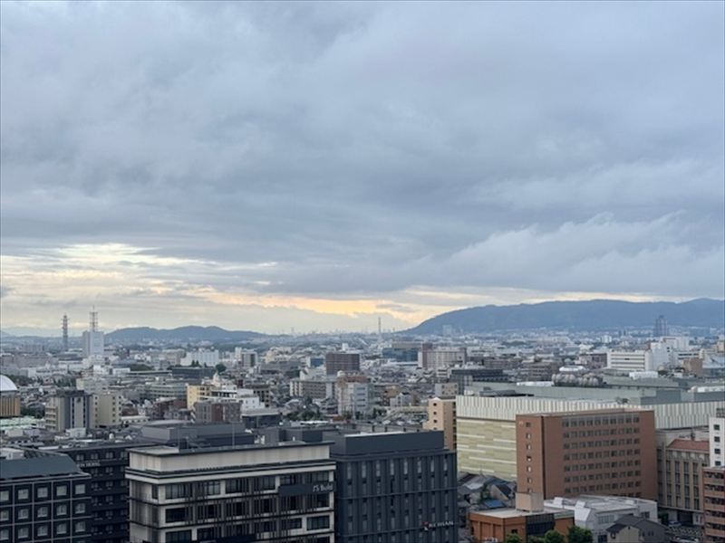 9月13日、鎌田東二百日祭「かまたまつり」が開催されました。その日の朝、わたしはJR京都駅に隣接したホテルの客室で目覚めました。その日の朝の京都は曇りで気温は25度でしたが、日中は32度まで上昇しました。ホテルの客室にはバルコニーがあったので、午前6時くらいに外に出てみると、比叡山が見えました。