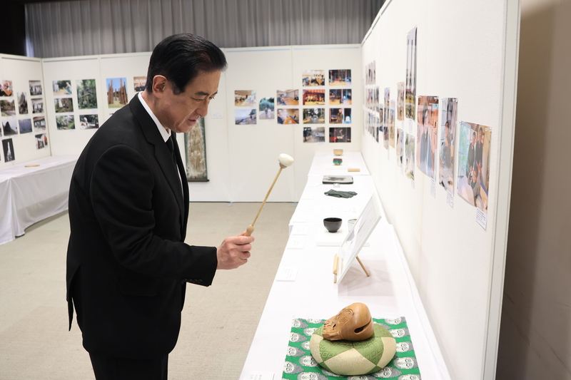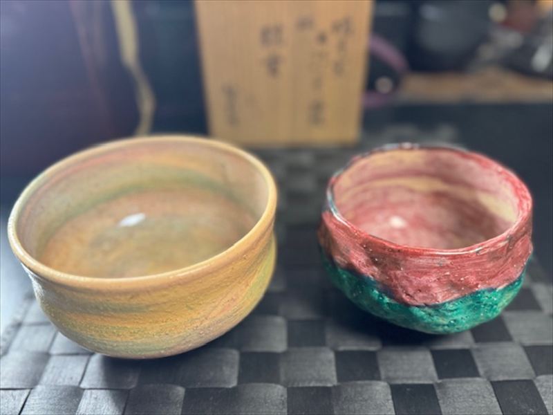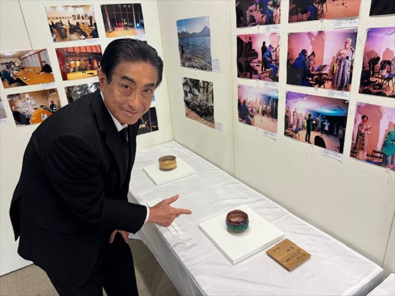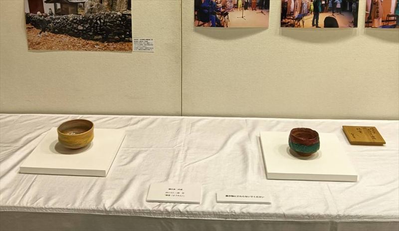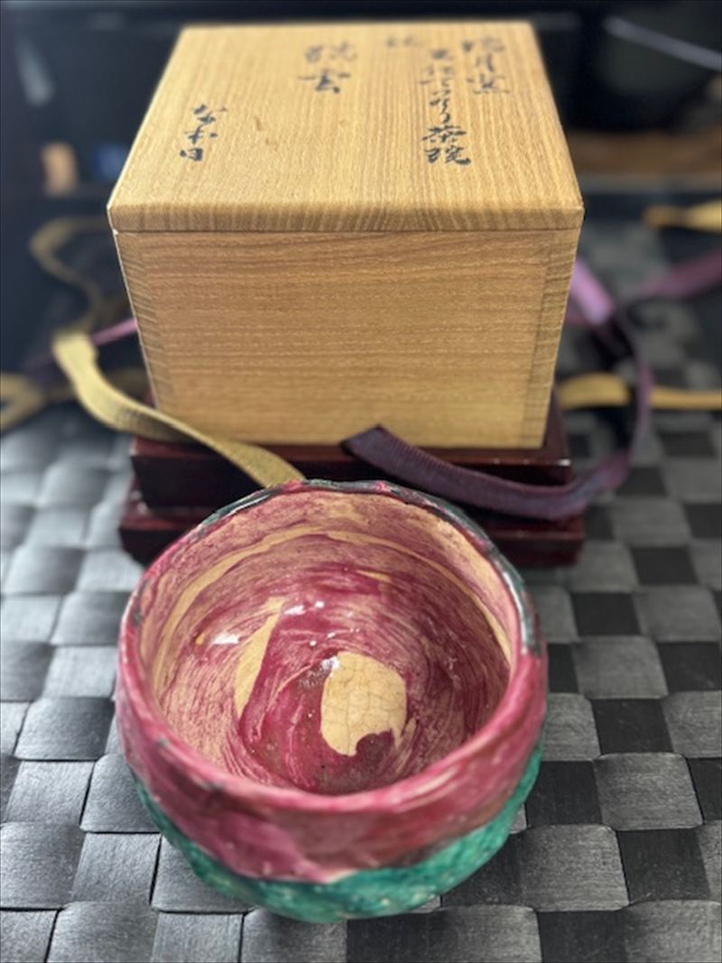 「かまたまつり」では、Tonyさんが生前に愛用した数々の品が展示されていましたが、その中でもひときわ目を引いたのが2個の茶器でした。これは「耀盌(ようわん)」と呼ばれる器です。大本教の出口王仁三郎が念願して造った茶碗のことで、その独特の輝きと美しさで各界の芸術家や評論家に衝撃を与えました。評論家の加藤義一郎が「星の光」という意味を込めて名付け、その作品は展覧会などを通して国内外に広まり、平和を願う希望の光として多くの人々を勇気づけました。この2個の耀盌を鎌田先生の形見として、14日の朝、謹んで頂戴いたしました。