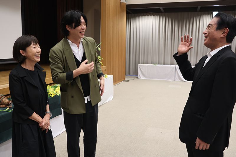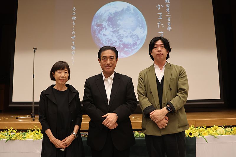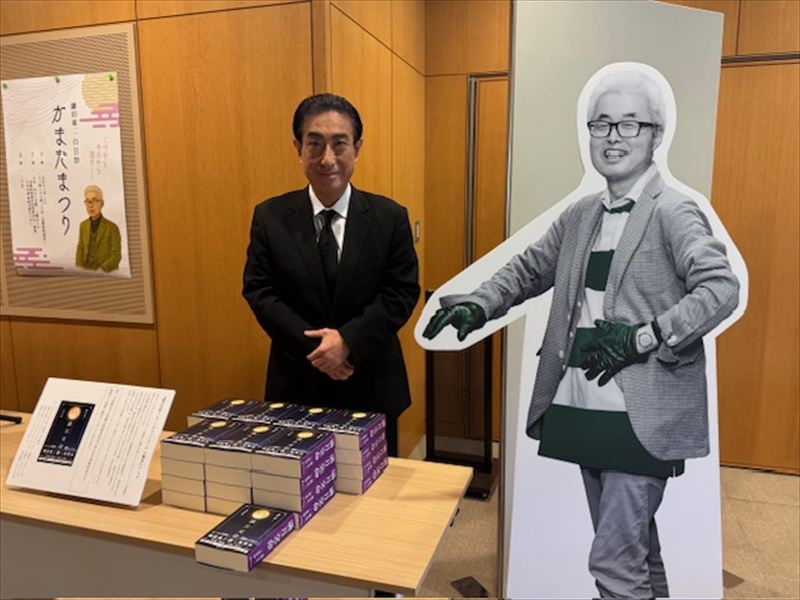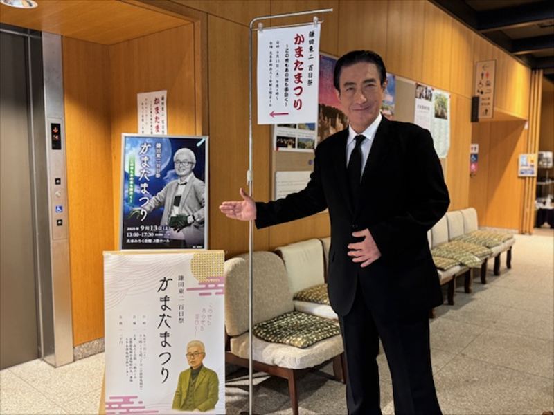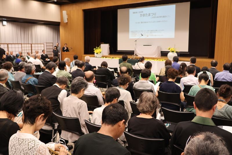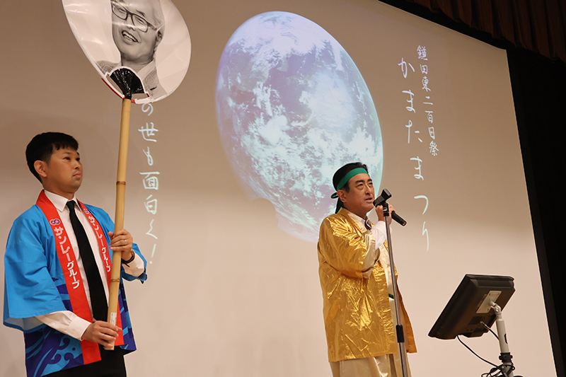 歌唱後、わたしは葬儀委員長として、そのままステージ上で謝辞を述べました。わたしは、「葬儀委員長でございます。こんな格好で失礼します。本日は、誠にありがとうございました。いま、魂のすべてを込めて、鎌田東二先生に捧げる『まつり』を歌わせていただきました。この曲の最後の一節、『これが鎌田のまつりだ〜よ〜!」と叫んだ瞬間、わたしの胸に去来したのは、先生のあの笑顔と、あのまっすぐな眼差しでした。鎌田先生は、日本を代表する宗教哲学者であると同時に、“いのちの現場”に生きた人でした。祈り、歌い、叫び、そして、どこまでも明るく、誰よりも熱く、『世直し』を語っておられました。わたしたちでそれを引き継いでまいりましょう!」と言いました。それから、わたしは「みなさま、本日は『かまたまつり』へご参集いただき、感謝いたします。みなさまのお力添えをいただき『かまたまつり』はフィナーレを迎えようとしています。葬儀委員長として心より御礼申し上げます。誠にありがとうございました」と述べました。