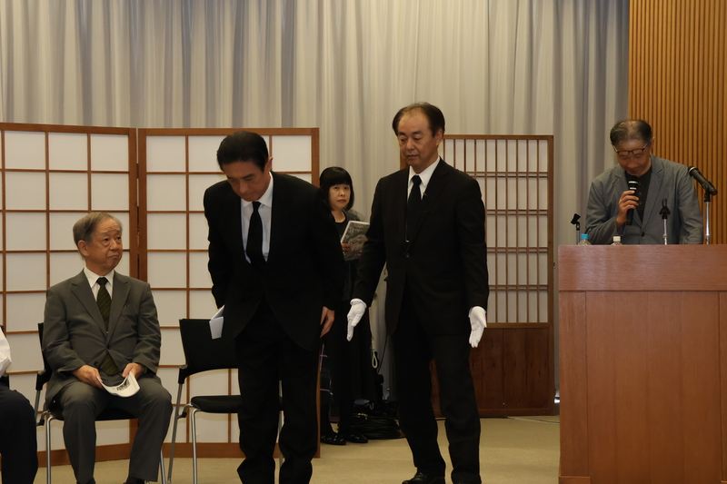 その後、友人代表の島薗進先生(東京大学名誉教授、東京自由大学学長)、来賓の柿坂神酒之祐氏(天河大弁財天社 名誉宮司)、アーティスト代表の近藤高広氏(陶芸家、現代美術家)、大本代表の山田歌氏(宗教法人大本 総務部長)、教え子代表の萩原正大氏といった生前の鎌田先生と縁の深い方々からの奉辞が続きました。いずれも心に沁みる内容でした。鎌田先生が希代の「縁の行者」であったことを再確認いたしました。最後は喪主であるご長男の鎌田龍明氏が御挨拶をされました。みなさん、心に沁みる素晴らしい奉辞を述べられました。