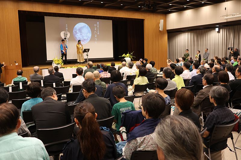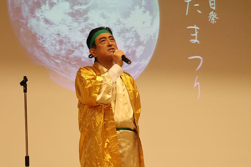 それから、わたしは「鎌田先生、お元気ですか? わたしたちは元気です! これから、鎌田先生が大好きだった『まつり』を歌います。月まで届け、この歌・・・」と言ってからカラオケがスタートしました。イントロ部分で「初宮祝に七五三、成人式に結婚式、長寿祝に葬儀を経て法事法要・・・人生は祭りの連続でございます。今日は出口王仁三郎聖師ゆかりの大本みろく会館で鎌田東二百日祭の『かまたまつり』ということで、めでたいなあ~。さあ、祭りだ、祭りだ~! 皆の衆、この世も、あの世も面白く行こうぜ!」と言うと、早くも会場が熱狂の坩堝と化しました。よし、つかみはOK牧場!(笑)