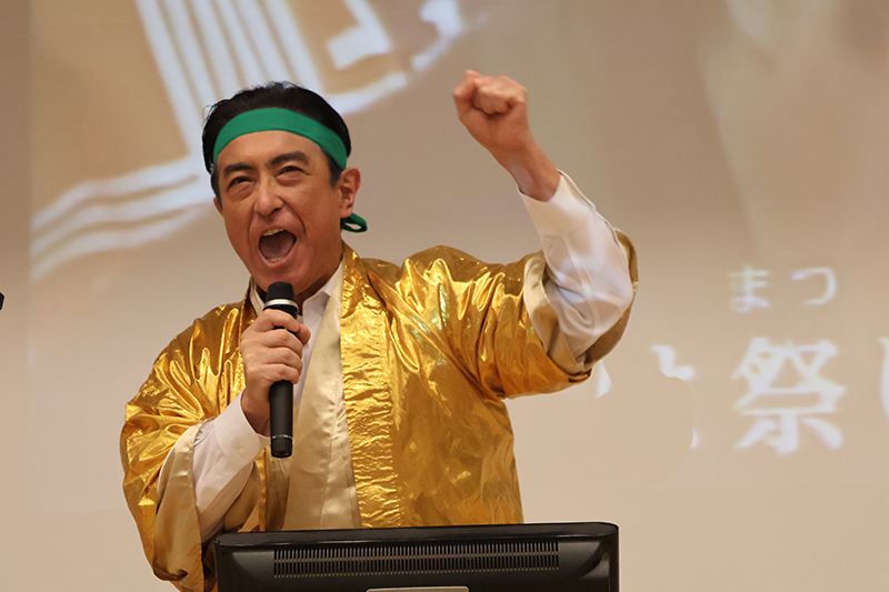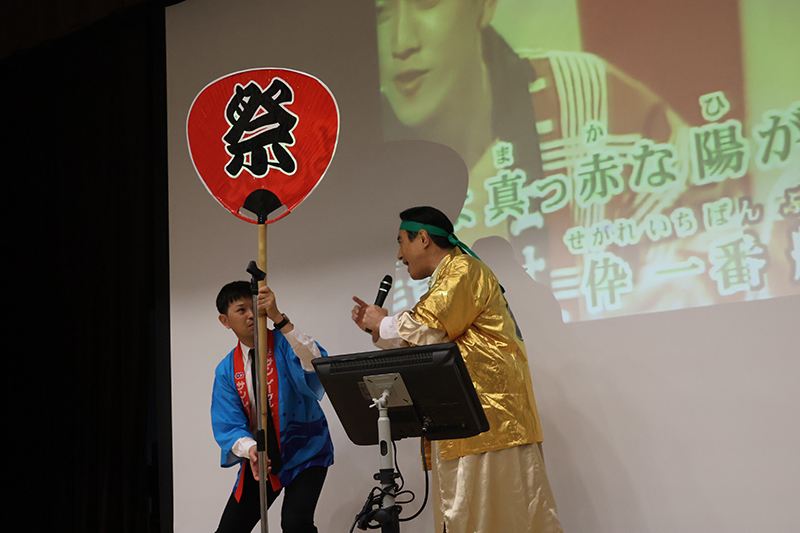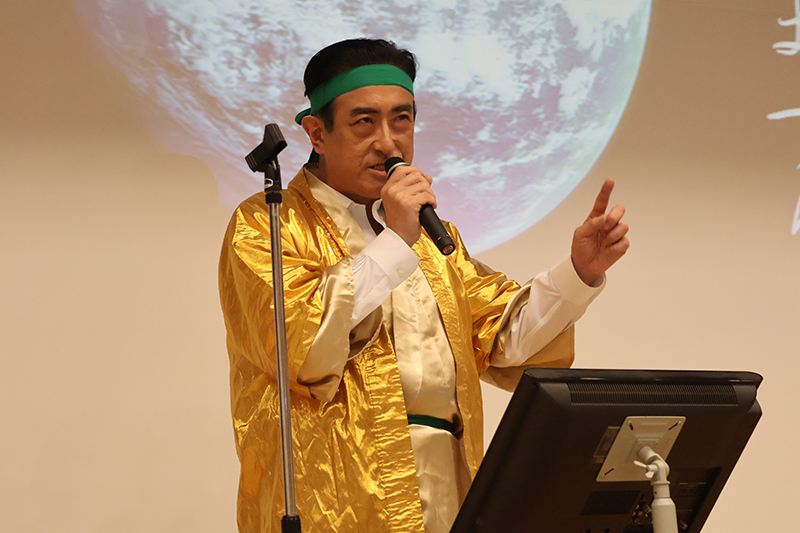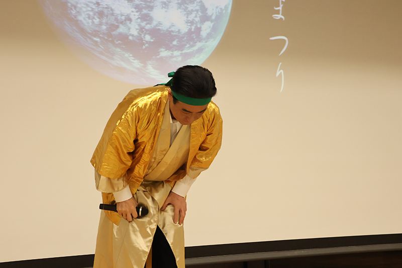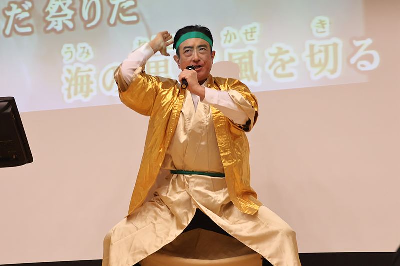 わたしが「男は〜ま〜つ〜り〜を〜♪」と歌い始めると、「祭」と書かれた巨大団扇やブルーの法被を着た助手が登場して、会場はカオス状態になりました。「山の神」「海の神」と口にするたびに大きな歓声が起きます。大本みろく会館の音響やスクリーンも最高です。まるで、出口王仁三郎聖師も応援してくれているような気分になりました。