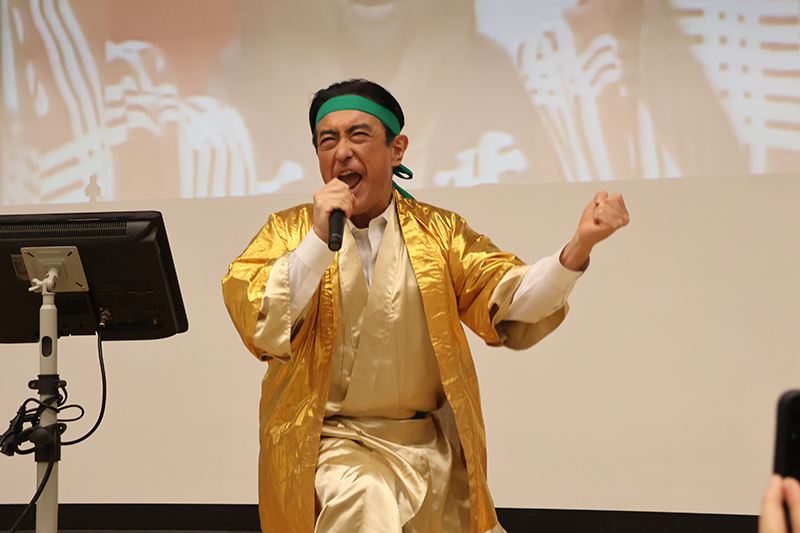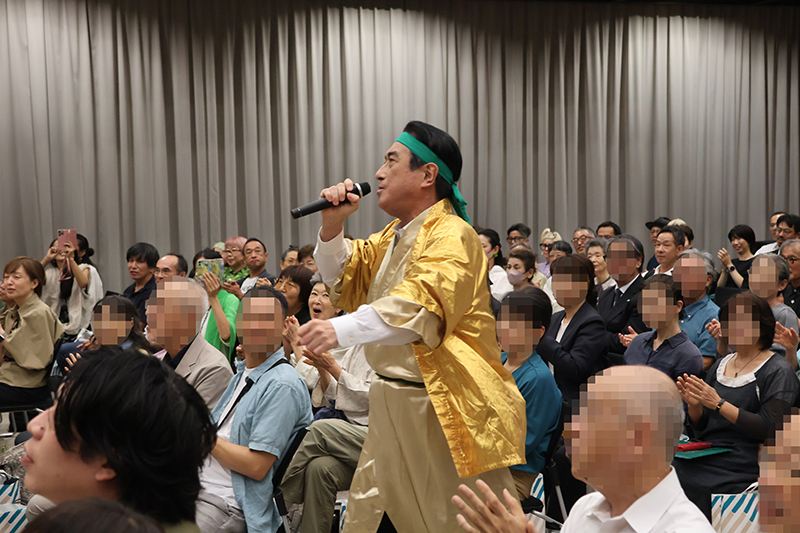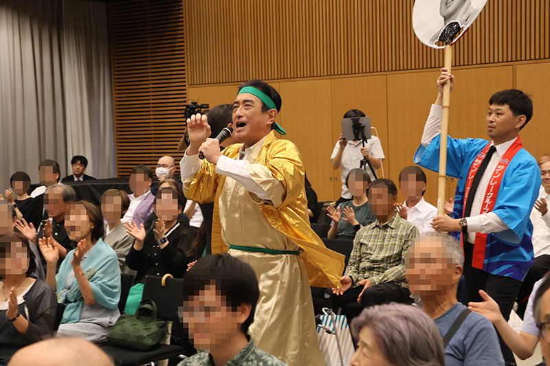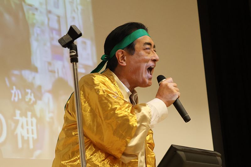 その他、ダンスや石笛や法螺貝の奏上などがありました。そして、ラストは、生前の鎌田先生との約束により、わたしが北島三郎の国民的名曲「まつり」を歌いました。わたしは背に「祭」と入った黄金の法被をまとって登壇しました。ただし、鉢巻きと腰帯だけは鎌田先生のイメージカラーであるグリーンに替えました。その装いでわたしが登壇すると、客席からどよめきが起こりました。