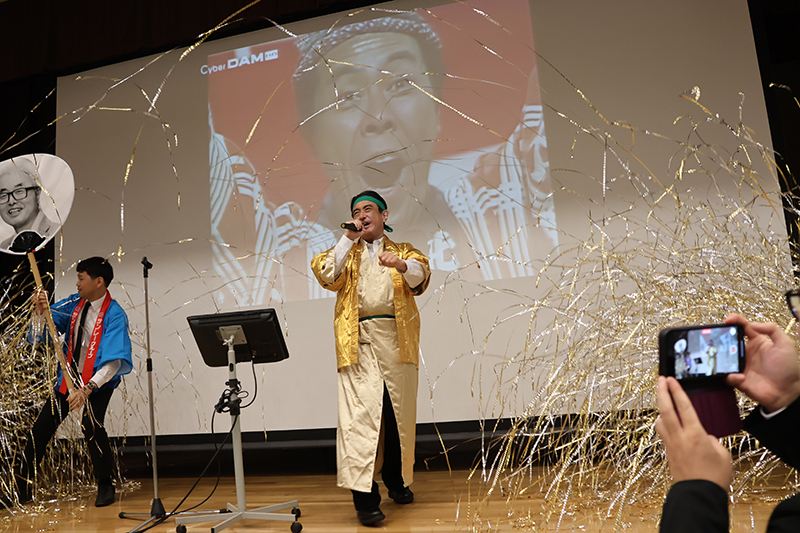 最後は、「これが日本のまつり~だ~よ~♪」の歌詞を「これが鎌田のまつり~だ~よ~♪」に替えました。興奮が最高潮に達しました。歌い終わって、「イエ〜イ!!」と叫ぶと、舞台の左右からジャンボクラッカーが鳴らされました。まさに「狂乱のカーニバル」そのもので、割れんばかりの盛大な拍手が起こりました。歌い終わったわたしは、「鎌田先生、そちらに行ったら、またカラオケ行きましょう! その日まで、オルボワール!」と言いました。透明人間になった鎌田先生は喜んで下さったでしょうか?